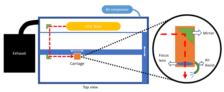 - Air assist is from the compressor which helps to prevent flare ups and keeps things clean by directing vapourised material downwards away from the cut and away from the machine's lenses and mirrors.